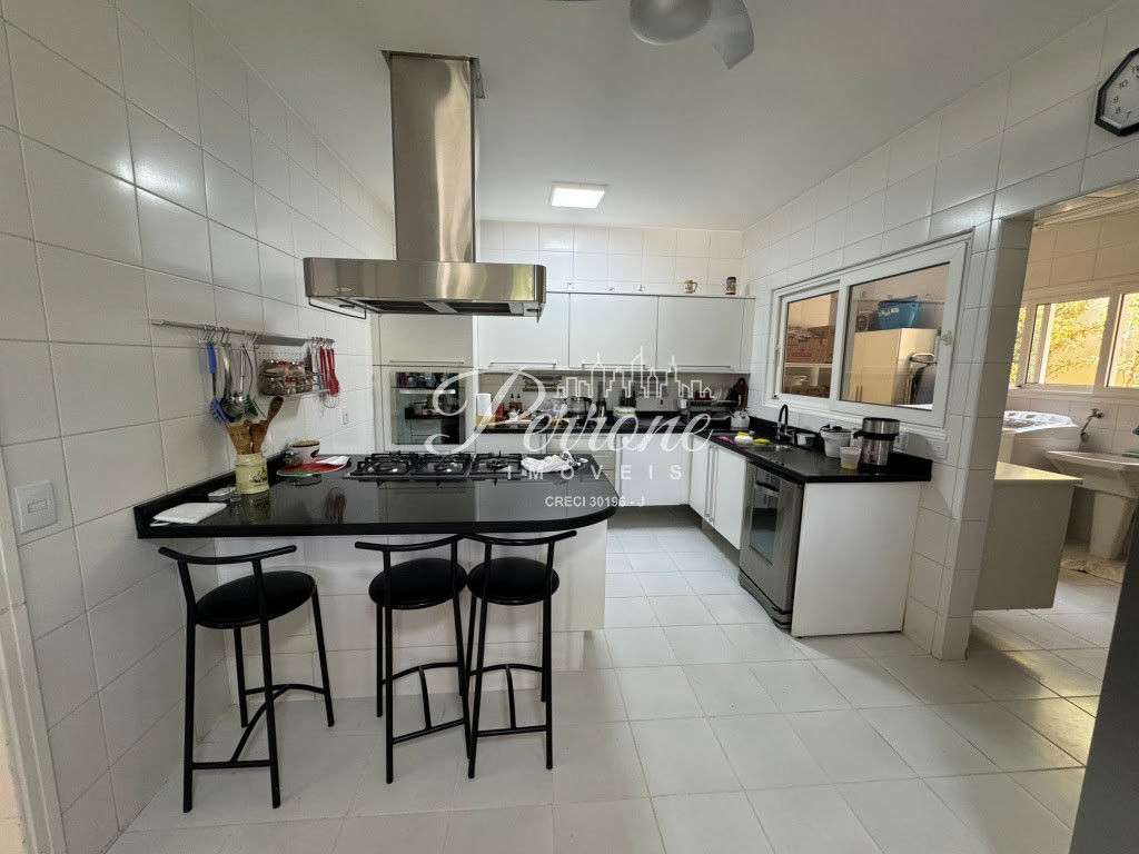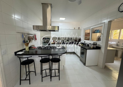 - Cozinha ampla com 2 janelas (uma delas pode ser usadas como passa-pratos para a área gourmet), pia de cuba dupla, armários embutidos, fogão cooktop com 5 bocas, forno em torre quente, geladeira e freezer, micro-ondas, máquina de lavar-louças e bancada que pode ser usada como copa com 2 lugares;