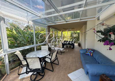 - Terraço fechado com esquadrias e ar-condicionado, em meio ao jardim, com sofá, mesa de jogos e mesa de Ping Pong;