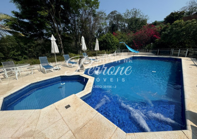 - Piscina infantil e piscina adulto, ambas cercadas, com hidromassagem e aquecimento por trocador de calor. Piscina adulto com praia, cascata e pequeno escorregador.