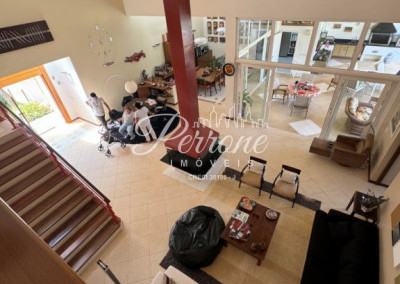 - Piso superior: Corredor de acesso com rouparia, bancada, armários, frigobar e vista para o piso inferior; 5 suítes, todas com ar-condicionado;