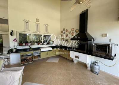 - Terraço gourmet com churrasqueira, fogão industrial à gás, forno elétrico, e chapa à gás, bancada e armários, com acesso ao jardim e à piscina por escada larga;